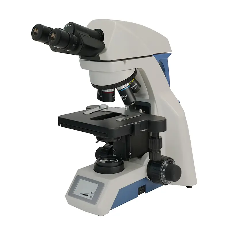 The LCD screen in the front of the BS-2054 series microscopes can display the working status of the microscope, including magnification, light intensity, standby status, etc.