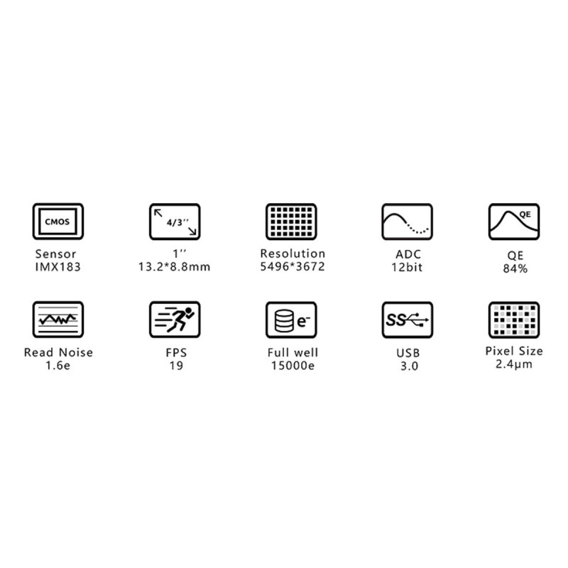 En planétaire, elle permet d’obtenir une résolution de 5496 x 3672px à la vitesse de 19images/seconde, avec une profondeur de 12bits. La vitesse d’acquisition atteint 308.2 images/seconde en résolution 320 x 240px à 10bits. Pour l’autoguidage, la caméra est équipée d’un port au standard ST4. L’ASI183MM possède un filetage d’entrée de type M42 femelle. Un convertisseur mécanique M42 vers 31.75mm mâle est livré, ainsi qu’un cordon USB de 2m de longueur et un cordon d’autoguidage ST4.