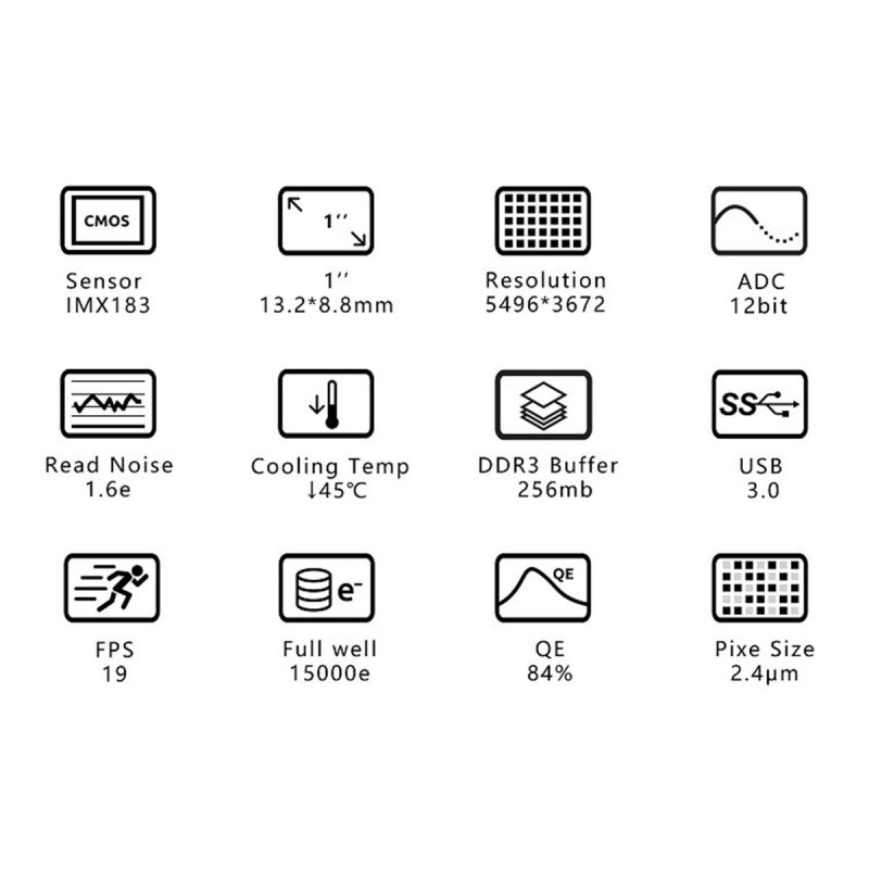 En planétaire, elle permet d’obtenir une résolution de 5496 x 3672px à la vitesse de 19images/seconde, avec une profondeur de 12bits. La vitesse d’acquisition atteint 308.2 images/seconde en résolution 320 x 240px à 10bits. L’ASI183MC-Pro possède un filetage d’entrée de type M42 femelle. Plusieurs câbles et adaptateurs sont livrés pour de multiples combinaisons (voir onglet “Documentation”).
