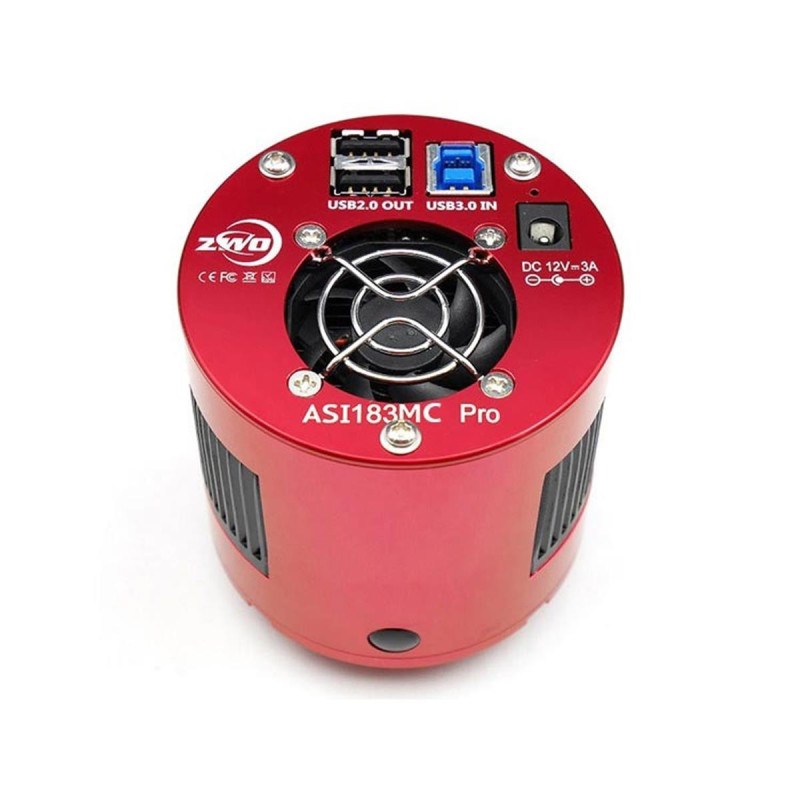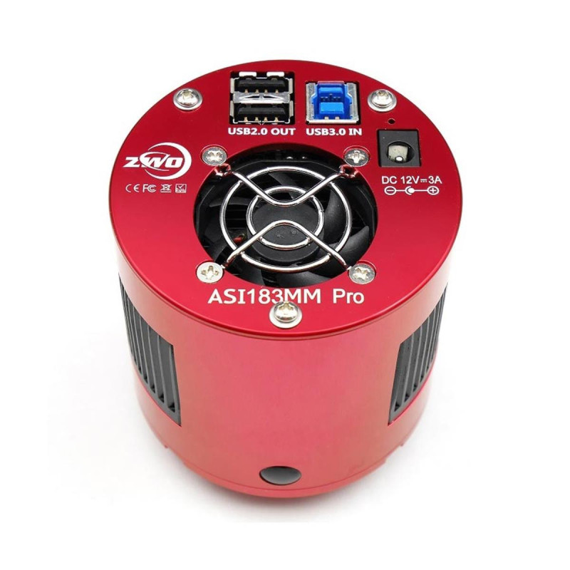 La société chinoise ZWO (Zhen Wang Optical) propose une gamme de caméras destinées à l’Astronomie dont les qualités, les performances et le prix sont surprenants. Le modèle ASI183MC-Pro est équipé d’un capteur monochrome au format 1″ de 20.2 millions de pixels (5496 x 3672px) avec une meilleure sensibilité et résolution que le modèle couleur et dont l’usage est très polyvalent. En effet avec un capteur si grand il se destine à l’imagerie lunaire et solaire tout en permettant d’accéder au ciel profondUn refroidissement sous la température ambiante de 40/45°C est obtenu grâce à l’action d’un module Peltier et d’un ventilateur silencieux pour réduire nettement le bruit thermique.